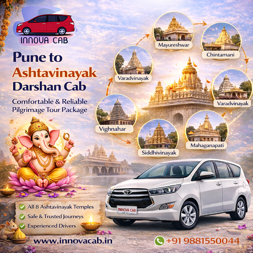 Pune to Ashtavinayak Darshan cab service by Innova Cabs offers a comfortable and spiritually fulfilling travel experience for devotees. The Ashtavinayak Yatra covers eight sacred temples of Lord Ganesha located across Maharashtra, typically completed in 1 to 2 days. Innova Cabs provides premium vehicles like Toyota Innova and Innova Crysta, ensuring a smooth and relaxing journey throughout the pilgrimage. Our experienced drivers are familiar with the temple routes and ensure timely darshan at each location. Whether you are traveling with family or in a group, our cab service guarantees comfort, safety, and convenience for your spiritual journey.