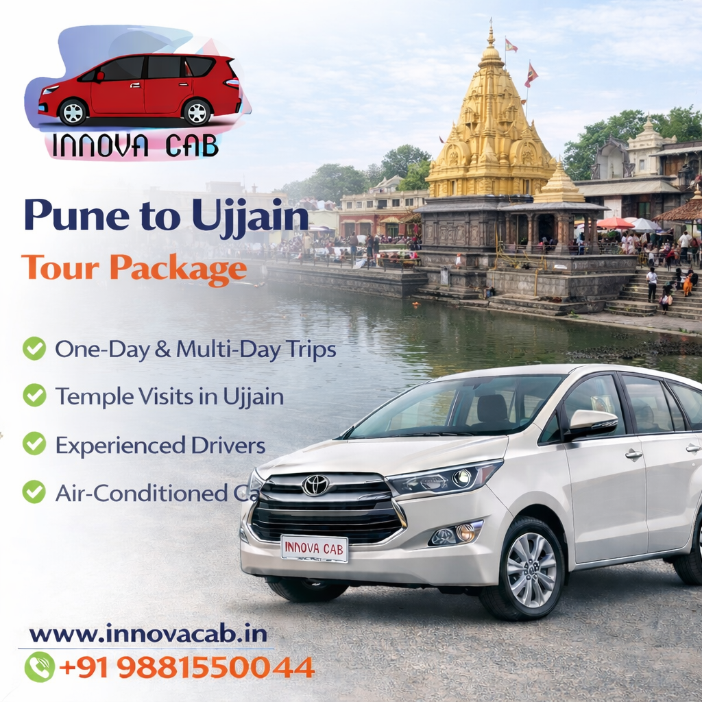 Pune to Ujjain Tour Package by Innova Cabs offers a comfortable and well-planned travel experience for devotees and tourists visiting the sacred city of Ujjain. Located in Madhya Pradesh, Ujjain is approximately 650–700 kilometers from Pune and the journey takes around 12 to 14 hours by road. Innova Cabs provides premium vehicles like Toyota Innova Crysta, ensuring a smooth and comfortable ride for long-distance travel. Our tour packages include flexible itineraries, door-to-door pickup, and experienced drivers who ensure a safe journey. Whether you are planning a religious trip or a family tour, our Pune to Ujjain package guarantees convenience, comfort, and peace of mind.